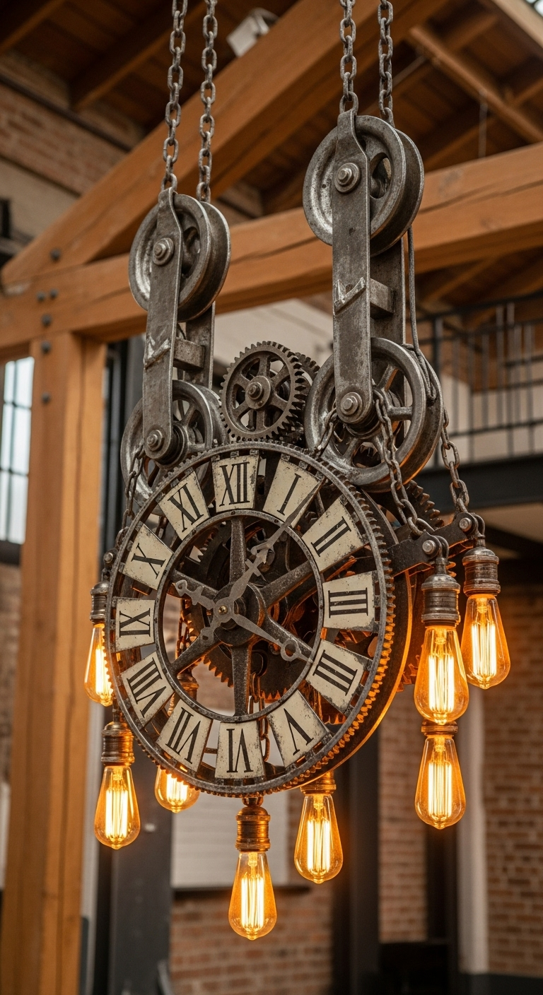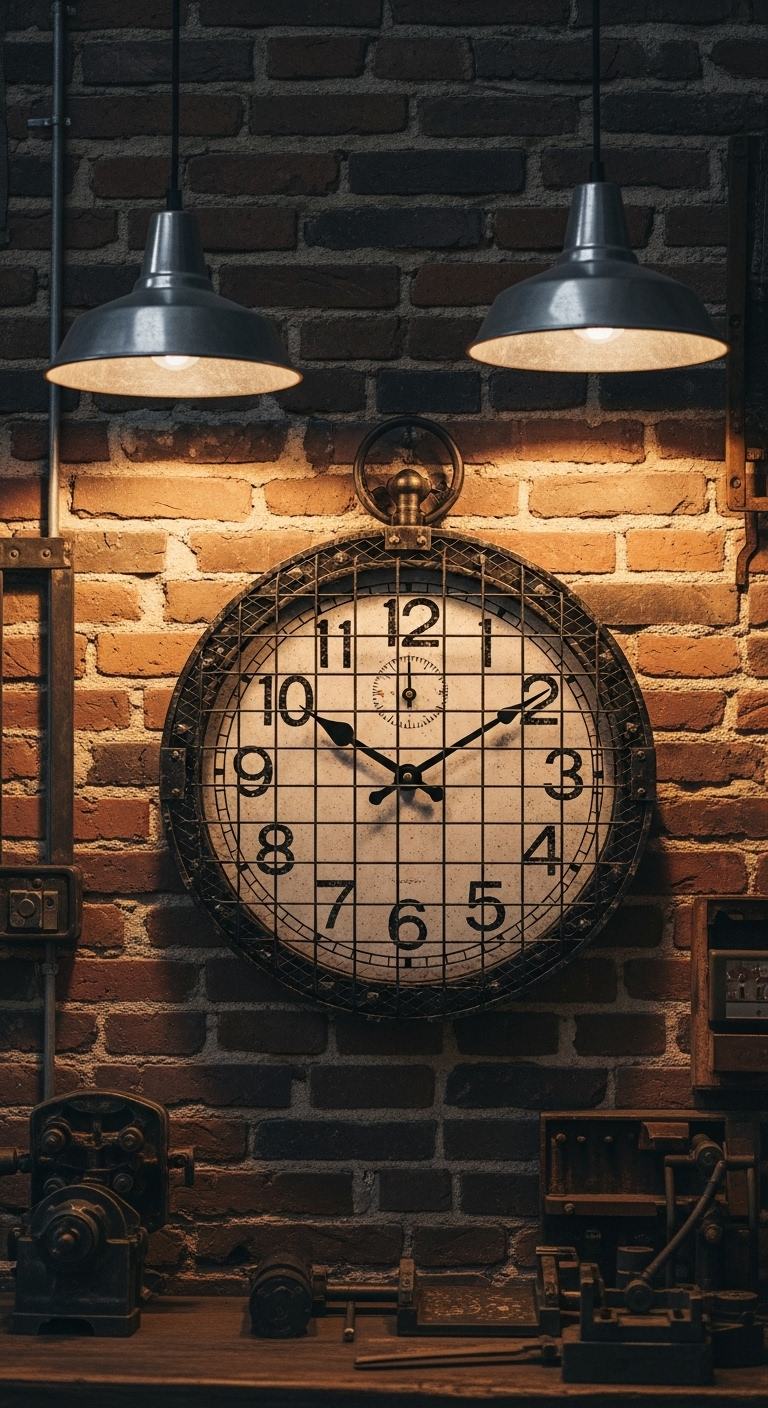Pour les puristes du style industriel, l’horloge à chaîne et poulie représente l’authenticité absolue. Directement inspirée des systèmes de chronométrage des usines historiques, cette horloge suspendue crée une déclaration architecturale forte et rappelle l’époque où le temps dictait le rythme du travail manuel.