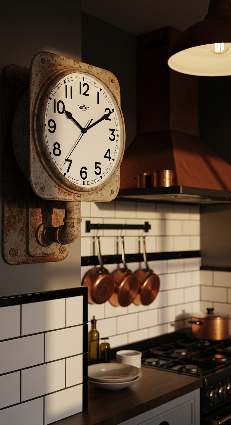Intégration dans votre décor : Cette horloge trouve naturellement sa place dans une cuisine de style industriel, un bureau à domicile ou même un garage aménagé. Elle dialogue parfaitement avec d’autres éléments métalliques comme les luminaires suspendus en forme de cage, les étagères en tuyaux de plomberie ou les tabourets en métal recyclé.