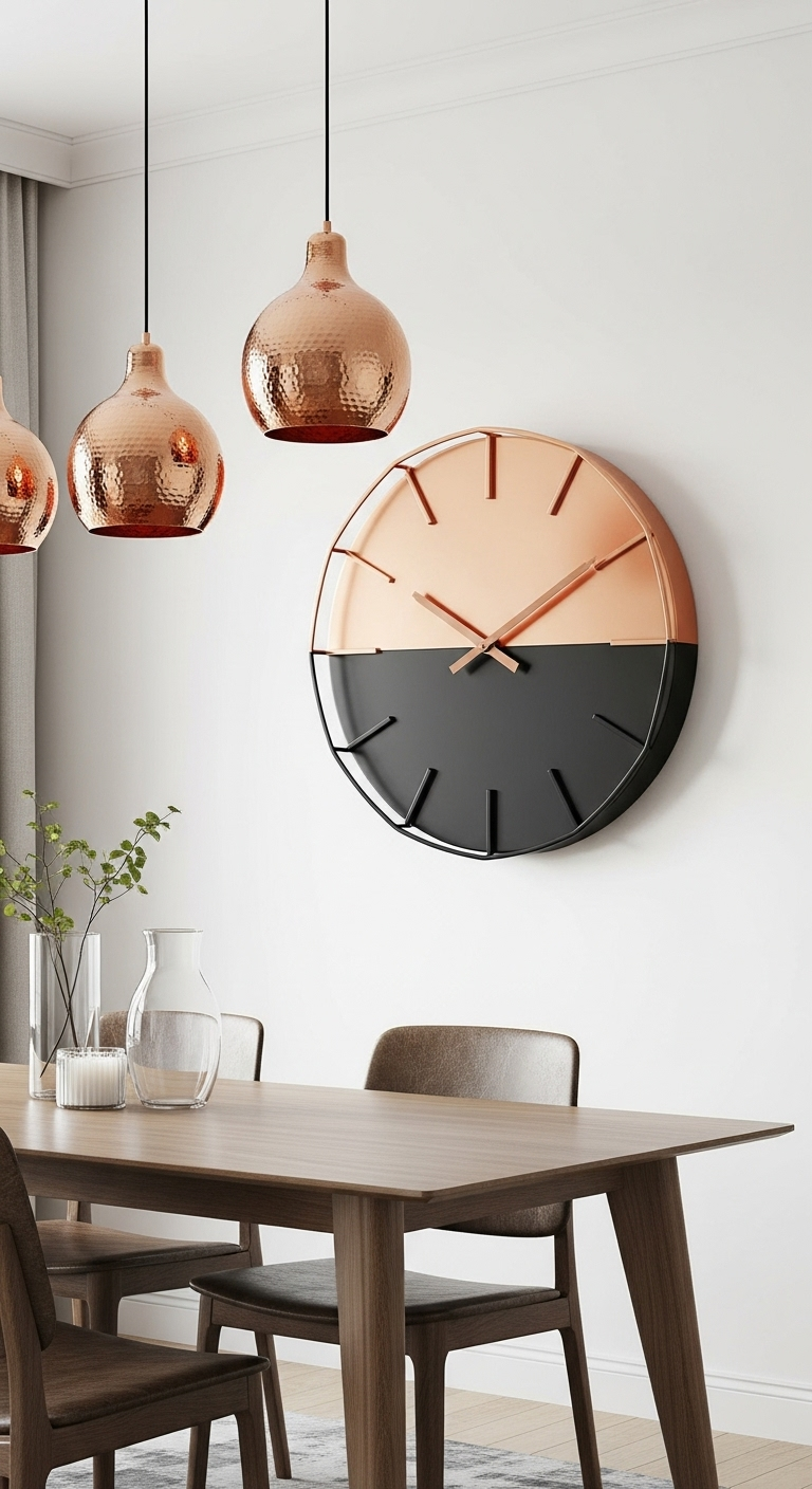 Pour créer du contenu Pinterest engageant, photographiez cette horloge à l’heure dorée lorsque la lumière naturelle fait ressortir les reflets cuivrés. Créez des flat lays incluant des accessoires dans les mêmes tons : tasses en cuivre, carnets noirs, plantes aux pots métalliques. Le contraste visuel fort de cette horloge garantit des épingles qui se démarquent dans le fil Pinterest et incitent au clic.