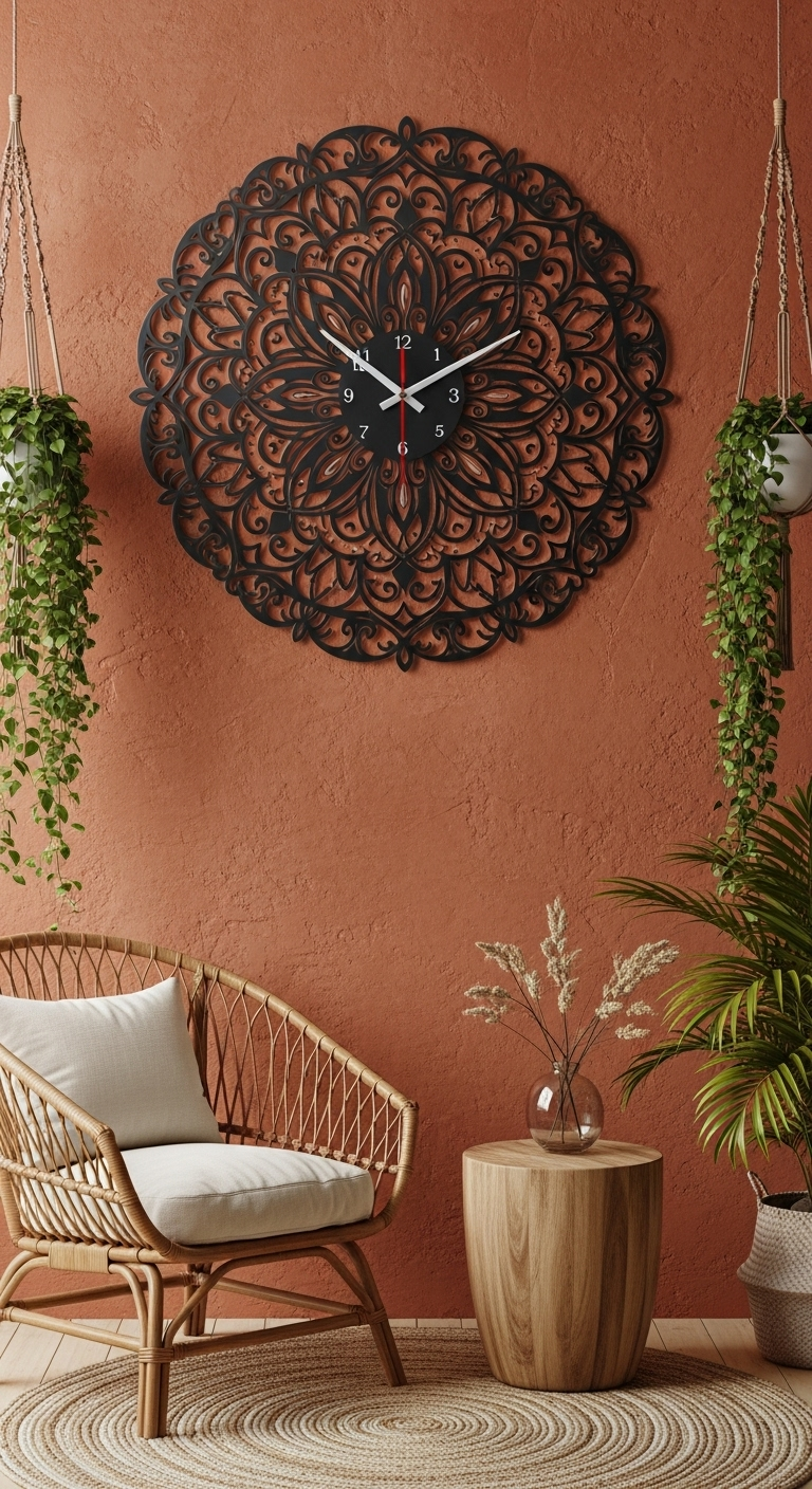 Créer l’ambiance bohème-industrielle parfaite : Entourez cette horloge d’éléments naturels et texturés qui équilibrent son côté métallique : macramés muraux, plantes suspendues en cascade (pothos, lierre), paniers en rotin, coussins à pompons, et tapis berbère. Les murs dans des tons chauds (terracotta, ocre, beige rosé) subliment particulièrement ce type d’horloge.