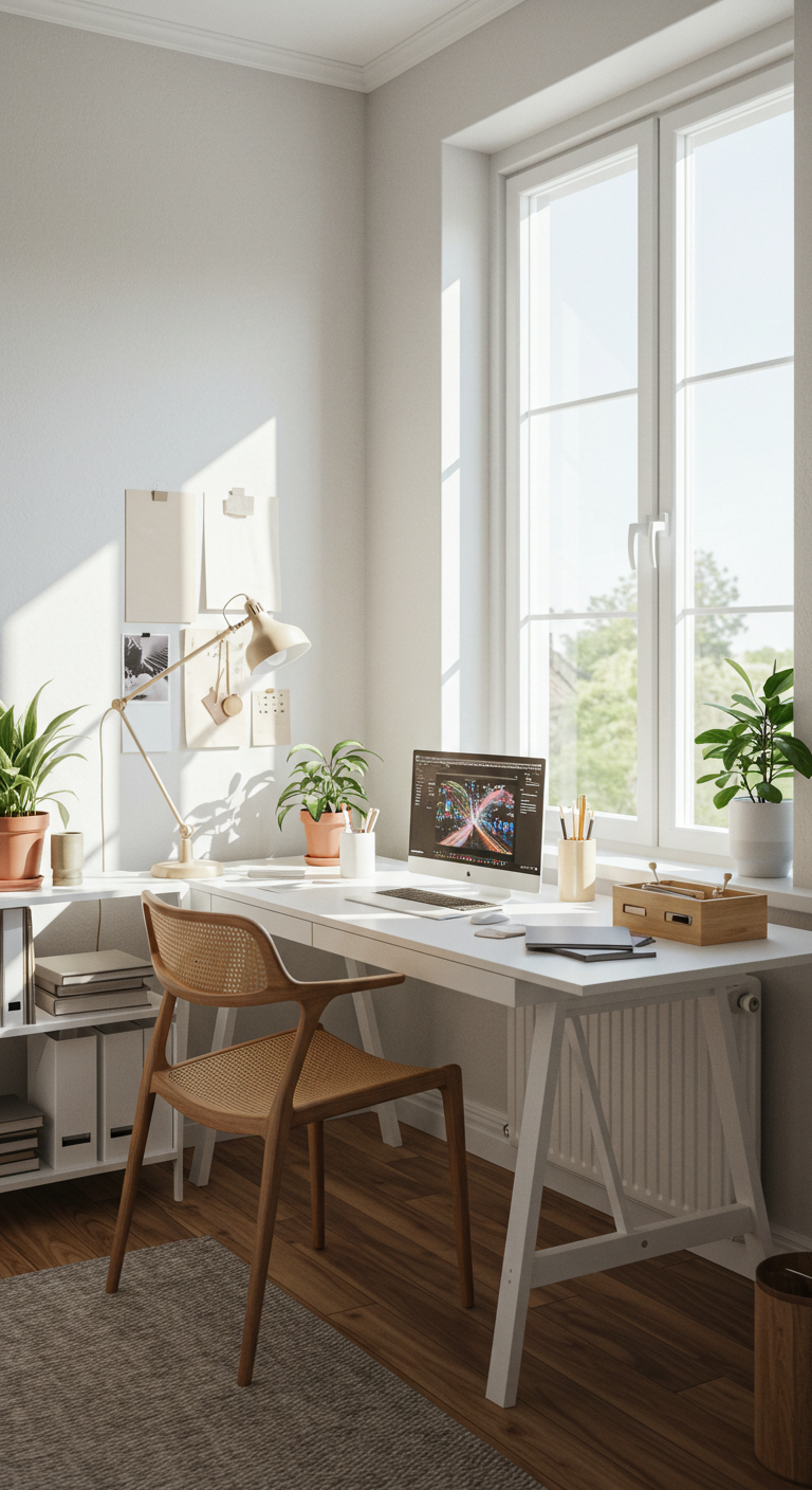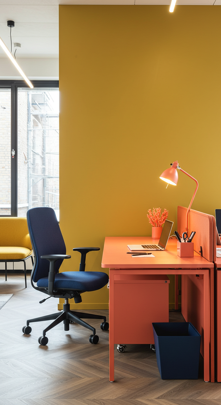 Le bleu favorise la concentration et la créativité, le jaune stimule l’optimisme et l’innovation, le vert apporte calme et équilibre, tandis que des touches de corail ou terracotta ajoutent chaleur et énergie. L’astuce est de créer un équilibre : utilisez une couleur dominante neutre (blanc, gris clair, beige) comme base, puis ajoutez 2-3 couleurs d’accent à travers vos accessoires, votre chaise de bureau, un mur d’accent, ou vos objets décoratifs.