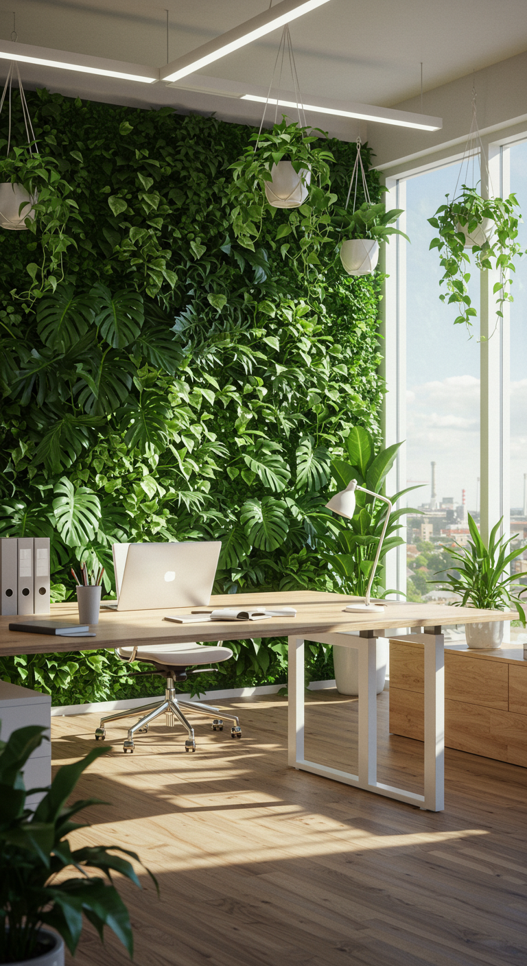 Créez votre propre jungle urbaine en installant des étagères flottantes garnies de pothos, de monsteras, de succulentes ou de fougères. Si vous disposez d’espace, envisagez un véritable mur végétal vertical qui deviendra instantanément le point focal de votre bureau. Les plantes purificatrices d’air comme le lierre, la sansevieria ou le chlorophytum sont particulièrement recommandées.