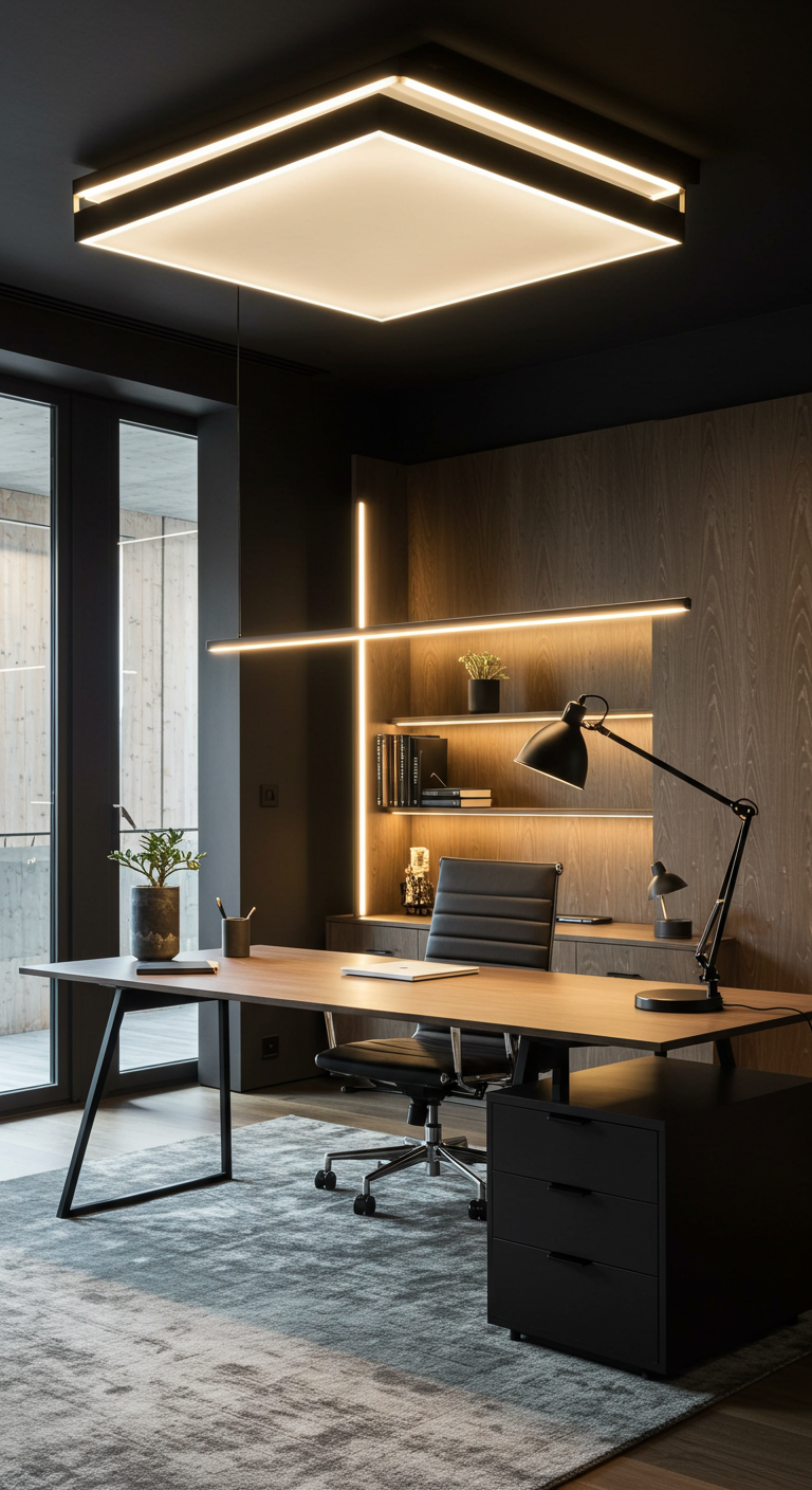Adoptez une approche d’éclairage en couches : une lumière ambiante générale (plafonnier ou suspension design), un éclairage de tâche directionnel (lampe de bureau LED ajustable), et un éclairage d’accentuation pour créer de l’atmosphère (lampadaires ou bandes LED). Privilégiez les lampes avec température de couleur ajustable (2700K-5000K) pour adapter l’éclairage selon le moment de la journée.