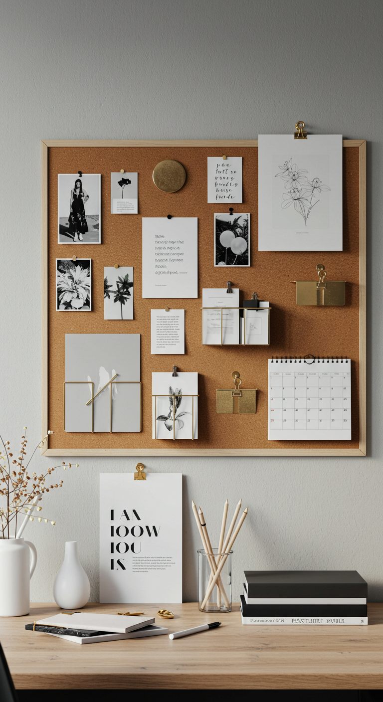 Installez un grand tableau en liège encadré de bois naturel ou peint dans une couleur tendance (terracotta, vert sauge, ou noir mat). Utilisez des punaises dorées ou cuivrées pour épingler vos inspirations, objectifs, calendrier mensuel et notes importantes. Complétez avec un tableau magnétique élégant pour vos to-do lists quotidiennes ou un système de grille métallique (pegboard) personnalisable.