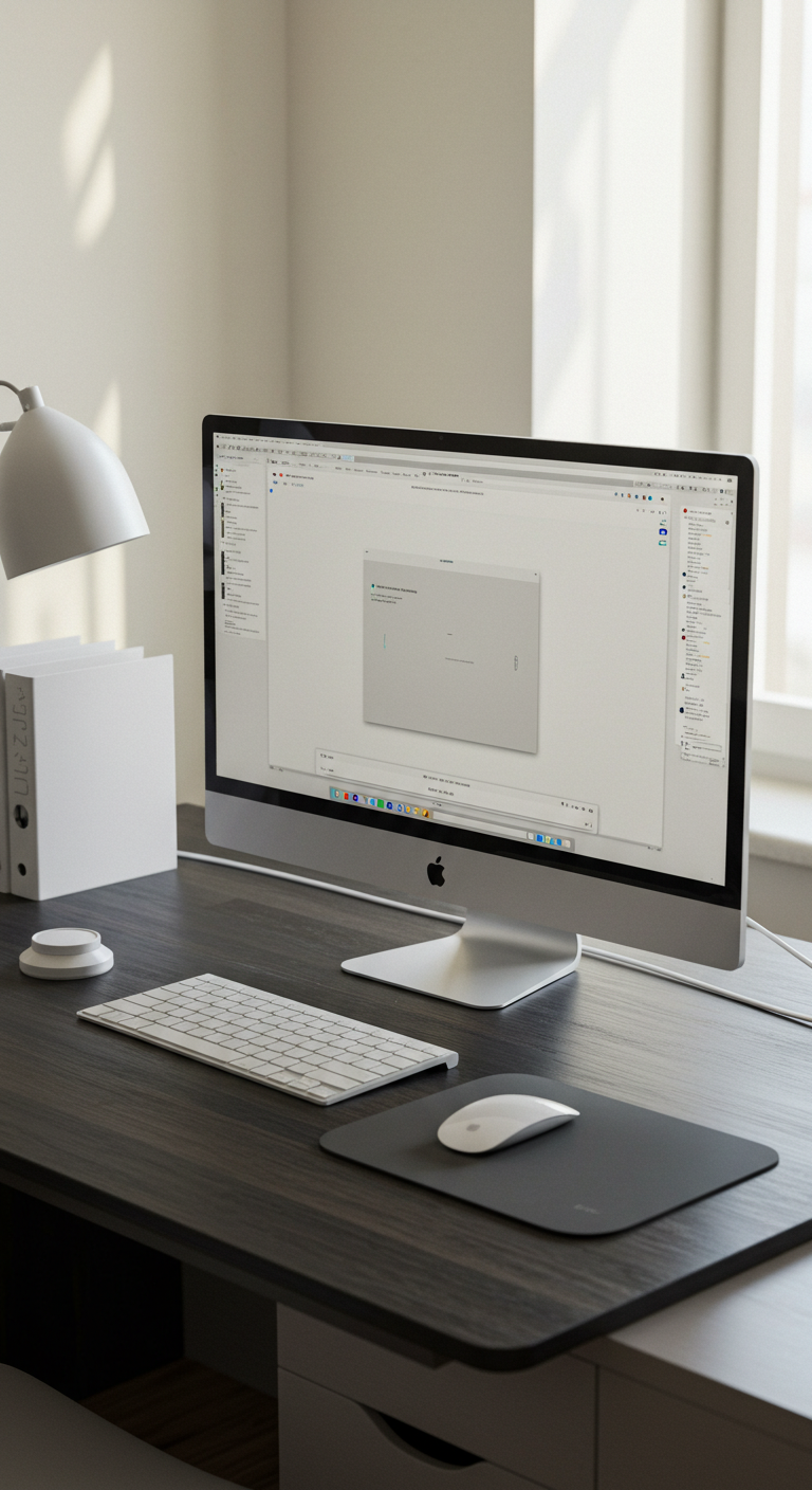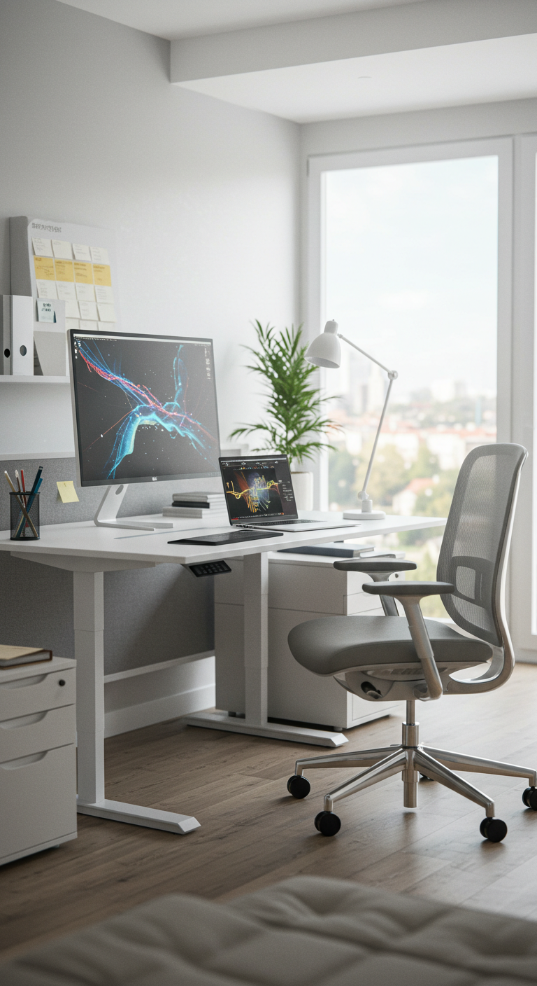 Investissez dans une chaise ergonomique au design contemporain (style Herman Miller, mesh respirant, formes sculptées) qui soutient votre dos sans ressembler à un équipement médical. Considérez un bureau assis-debout avec mécanisme discret ou des pieds réglables design. Positionnez votre écran à hauteur des yeux avec un support élégant, utilisez un repose-poignet en cuir ou liège pour votre clavier, et ajoutez un repose-pieds subtil si nécessaire.