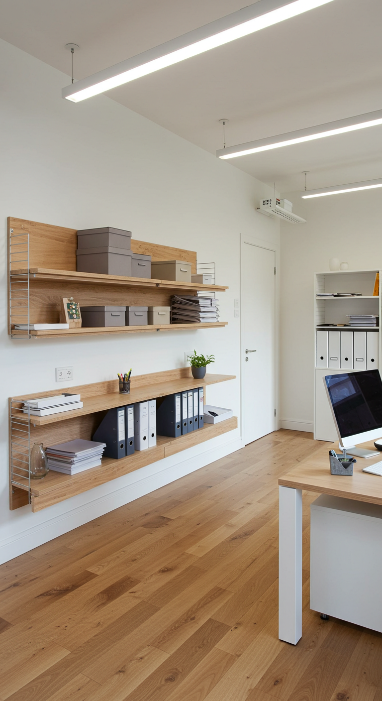 Installez des étagères flottantes en bois ou métal aux lignes épurées à différentes hauteurs pour créer un intérêt visuel. Utilisez des boîtes de rangement esthétiques et uniformes (en tissu, rotin, ou carton décoré) pour organiser vos fournitures, documents et petits objets. Considérez un système d’étagères modulables qui s’adapte à vos besoins changeants, ou des casiers muraux ouverts style industriel pour un look plus brut et contemporain.