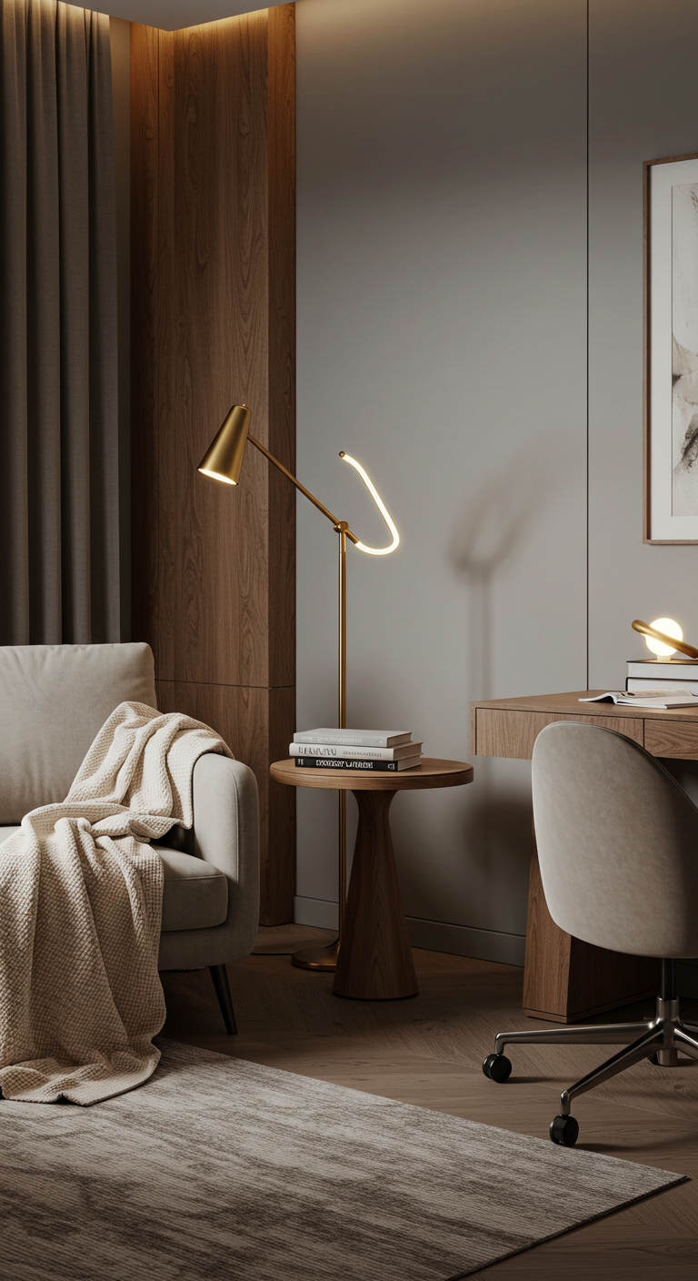Investissez dans des luminaires au design architectural – des pièces statement comme une lampe articulée en métal noir, une suspension géométrique minimaliste, ou une lampe arc contemporaine. Ces éléments fonctionnent comme de véritables sculptures tout en fournissant un éclairage optimal qui protège vos yeux et booste votre énergie.