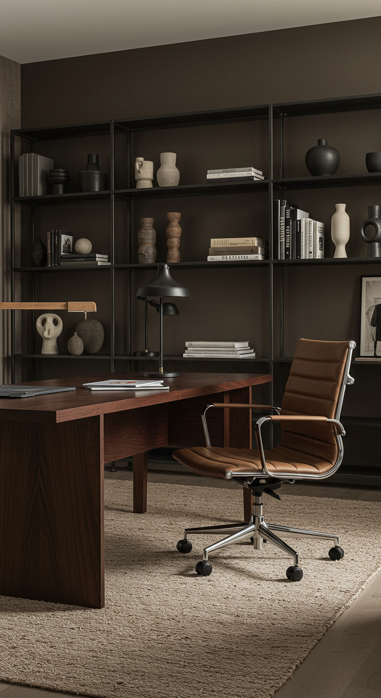 Combinez stratégiquement le bois (chaleur naturelle), le métal (structure moderne), le verre (légèreté), le cuir (sophistication), la céramique (artisanat), et les textiles (confort). Par exemple : un bureau en bois massif avec des pieds en métal noir, une chaise en cuir cognac, des accessoires en céramique mate, un tapis tissé sous le bureau, et des touches de laiton brossé.