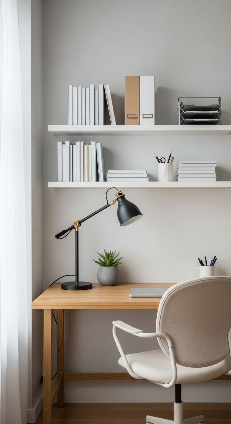 L’éclairage du bureau est primordial : une lampe de travail au design épuré avec bras articulé en bois et métal blanc cassé assurera un éclairage optimal. Gardez le bureau dégagé en rangeant quotidiennement – cette discipline est au cœur de la philosophie scandinave où l’ordre extérieur favorise la clarté mentale.