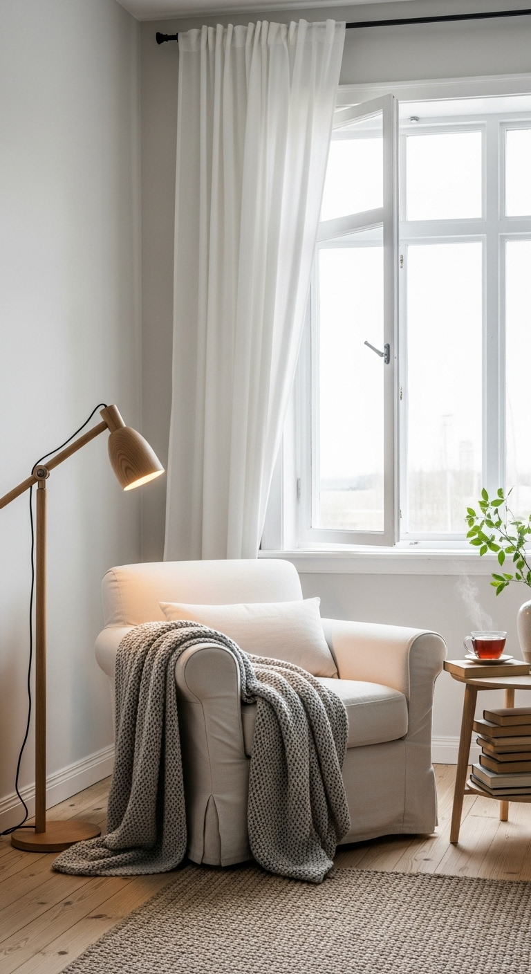Créez un refuge personnel avec un coin lecture scandinave enveloppé de blanc cassé. Choisissez un fauteuil confortable au design épuré, idéalement en lin lavé couleur crème ou en velours côtelé blanc cassé pour une touche plus luxueuse tout en restant naturelle.