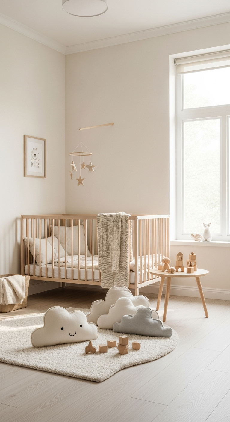 Pour la décoration, privilégiez quelques éléments de qualité : une guirlande lumineuse douce, des coussins en forme de nuages ou d’animaux dans des tons naturels, et des illustrations minimalistes encadrées en bois clair. L’espace doit rester épuré pour ne pas sur-stimuler l’enfant, tout en étant chaleureux et sécurisant.