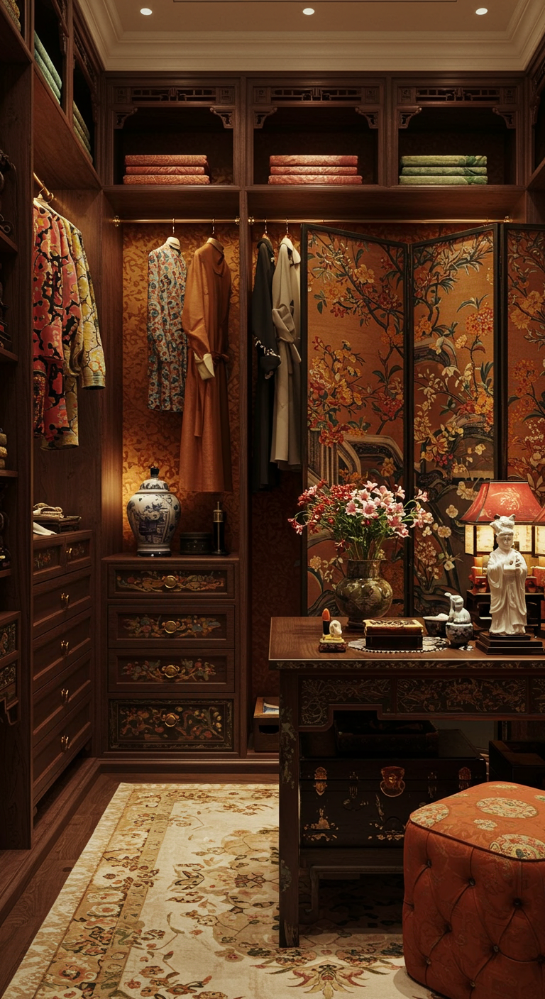 Les fastes de l’Orient s’épanouissent dans ce dressing aux influences asiatiques marquées. Cette esthétique cultive l’exotisme raffiné et la richesse ornementale pour un dépaysement quotidien garanti.