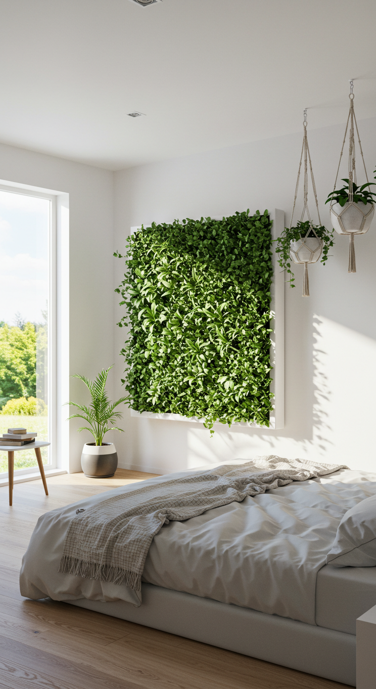 Créez un mur végétal spectaculaire sans effort en suspendant plusieurs plantes à différentes hauteurs. Cette technique apporte instantanément une touche de verdure vivante à votre chambre tout en purifiant l’air naturellement.