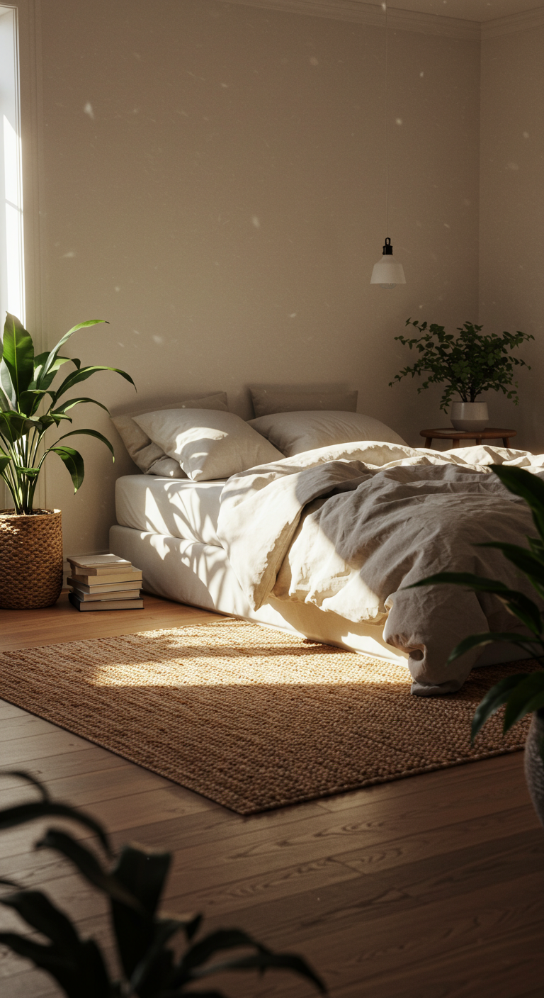 Un tapis en fibres naturelles définit l’espace chambre tout en apportant texture et confort sous les pieds. Les matières comme le jute et le sisal sont parfaites pour une déco nature authentique.