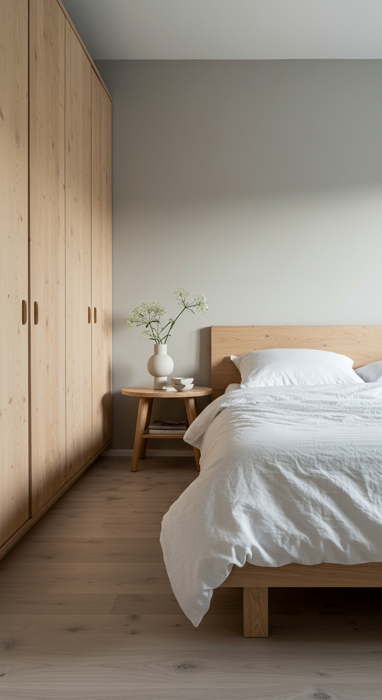 Le mobilier en bois clair non verni conserve l’aspect naturel du matériau tout en apportant luminosité et chaleur à la chambre.