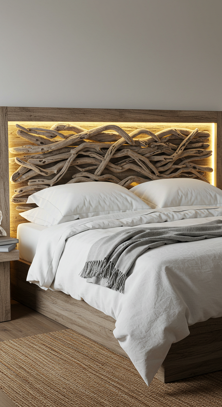 2. Tête de Lit en Bois Flotté avec Éclairage Intégré