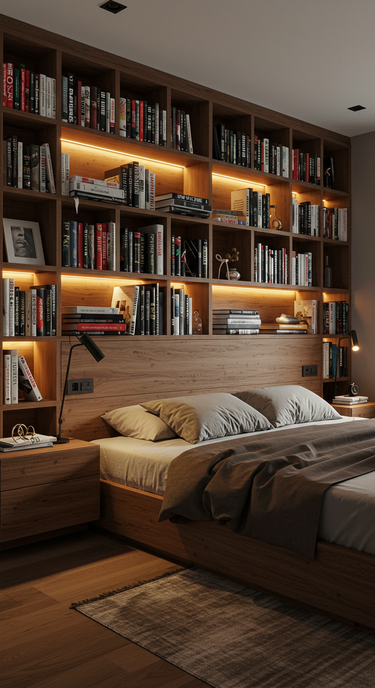 Variez les profondeurs d’étagères pour créer du dynamisme visuel : certaines accueillent les livres, d’autres des cadres photos, plantes ou objets décoratifs. Cette approche transforme la lecture en rituel quotidien et fait de votre chambre un espace culturel personnel où chaque ouvrage raconte une partie de votre histoire.