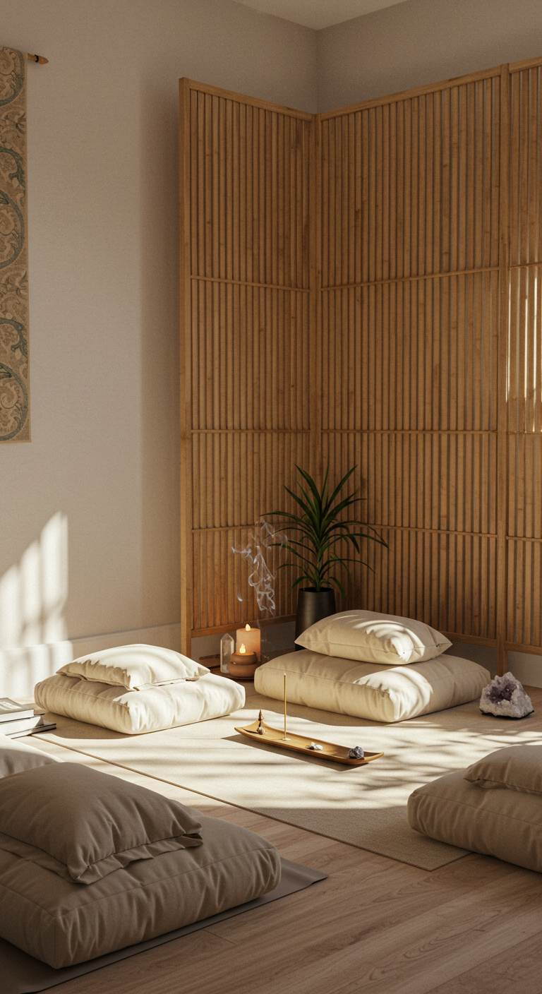 Délimitez visuellement cet espace avec un paravent en bambou, des rideaux légers ou simplement par la disposition des éléments. Choisissez des coussins de méditation traditionnels zabuton et zafu, ou optez pour des alternatives modernes en mousse mémoire recouverte de tissus naturels.