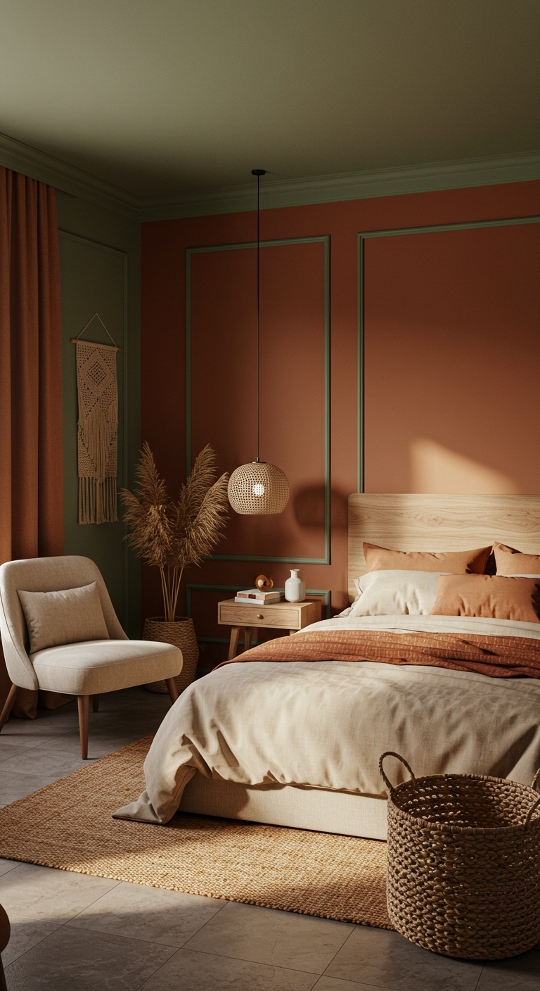 Déclinez les ocres, terracotta, verts sauge, beiges chauds et bruns noisette sur vos murs, textiles et accessoires. Ces couleurs, naturellement apaisantes, régulent l’humeur et favorisent l’endormissement. Associez-les à des matériaux bruts comme le bois non traité, la pierre naturelle, l’osier et les fibres végétales.