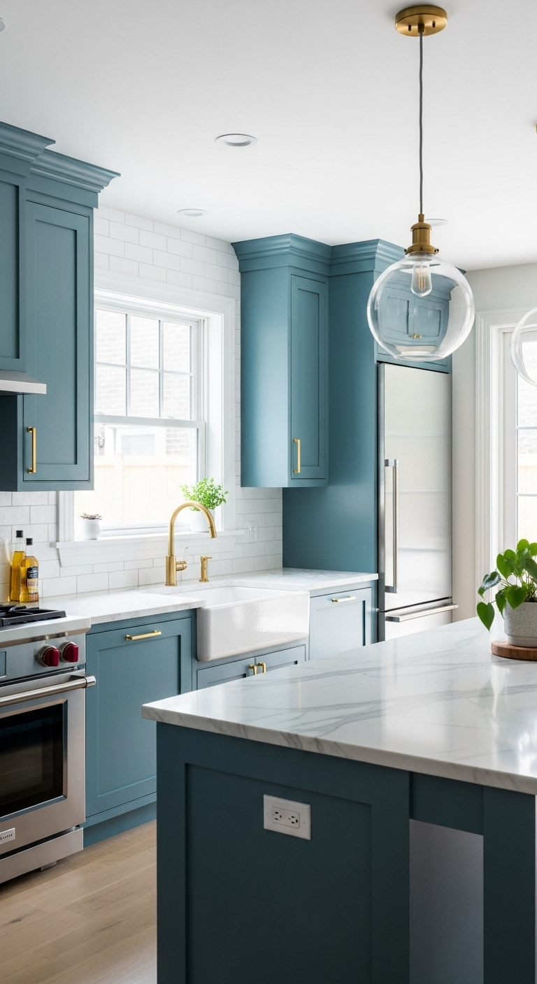 Pour accentuer le caractère contemporain de votre cuisine, optez pour des poignées et robinetterie en laiton doré ou en cuivre brossé. Ces métaux chaleureux créent un contraste sublime avec le bleu canard froid, ajoutant une touche de luxe discret. Un dosseret en carrelage métro blanc ou en zellige artisanal complétera parfaitement l’ensemble.