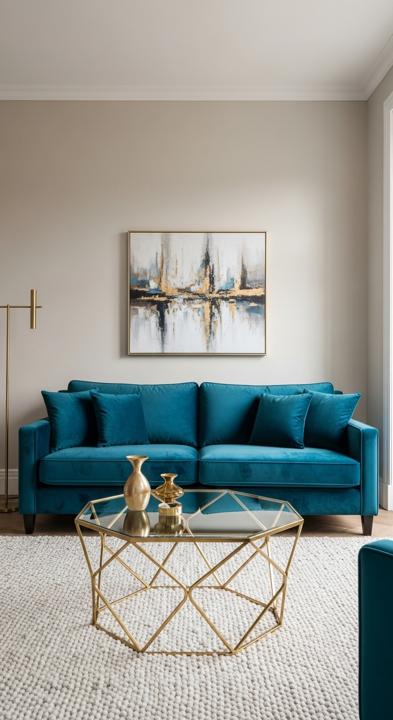 Les œuvres d’art, cadres photos, bougies parfumées, plateaux décoratifs, livres à couverture bleue canard, ou même des bouquets de fleurs artificielles peuvent tous contribuer à cette symphonie chromatique. L’astuce consiste à répartir ces touches de couleur dans toute la pièce selon un triangle visuel pour guider le regard et créer une cohérence décorative professionnelle.