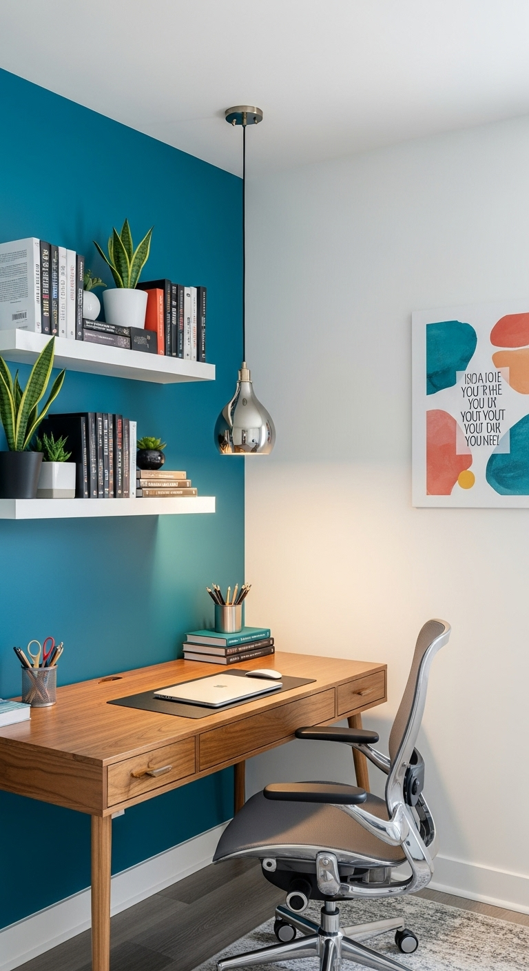 Un mur d’accent bleu canard derrière votre bureau crée un arrière-plan professionnel parfait pour vos visioconférences tout en délimitant visuellement l’espace de travail du reste de votre habitat. Cette séparation psychologique aide à maintenir un équilibre sain entre vie professionnelle et personnelle, particulièrement important dans les espaces de vie ouverts.