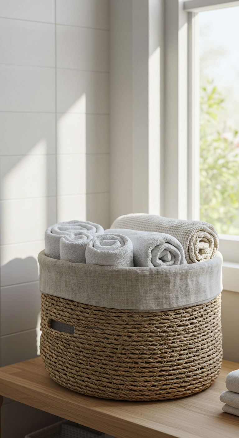 Choisissez des paniers en matériaux naturels comme le rotin, le jonc de mer, le bambou ou le bois tressé, doublés d’un lin écru ou beige. Cette combinaison de textures crée un effet visuel riche tout en restant dans une palette monochrome apaisante. Le lin protège également vos objets stockés des éventuelles aspérités du panier tout en maintenant une bonne aération, particulièrement important pour le linge ou les textiles.
