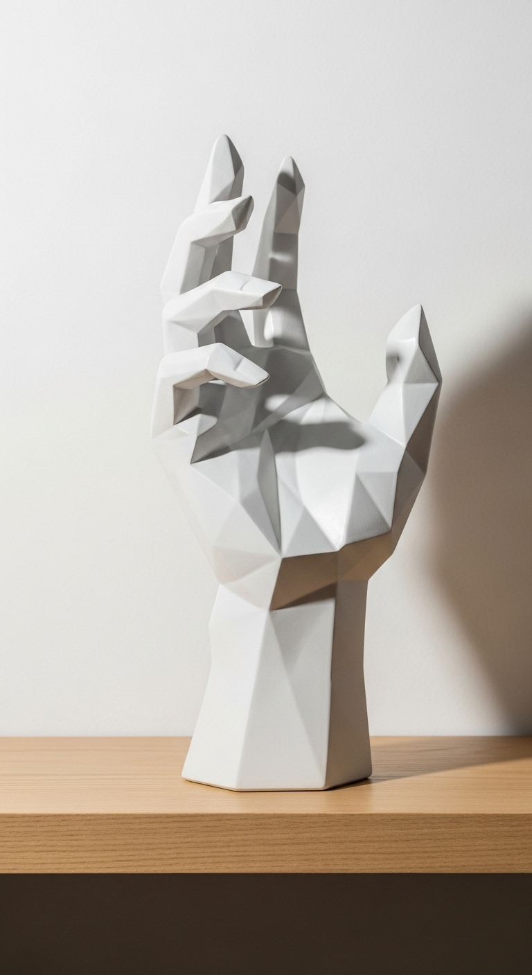 La main géométrique réinvente un symbole universel à travers le prisme du design contemporain. Cette sculpture transforme la forme organique de la main humaine en une composition de facettes angulaires et de plans géométriques, créant une tension fascinante entre nature et abstraction.