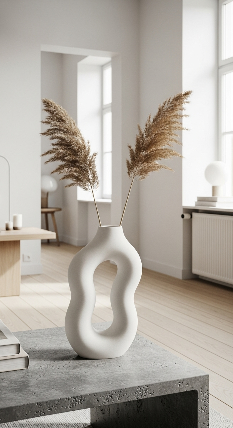 Garnissez-le de branches d’eucalyptus séché, de pampas grass ou de fleurs séchées dans des tons naturels pour rester fidèle à l’esthétique minimaliste. Sur une table basse, un buffet ou une étagère ouverte, ce vase crée instantanément un point focal artistique. Sa couleur blanche le rend extrêmement versatile, s’harmonisant aussi bien avec des intérieurs entièrement blancs qu’avec des espaces colorés où il apporte calme et équilibre.