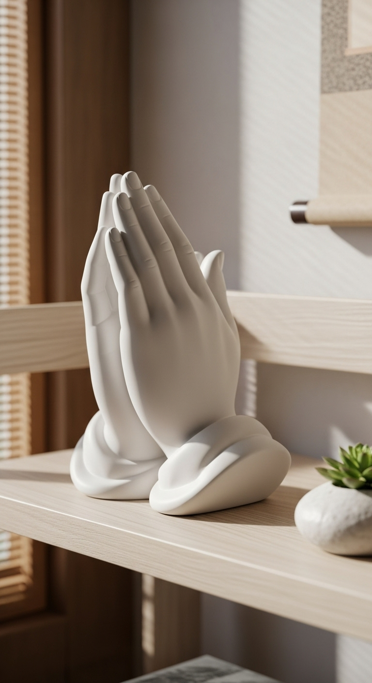 La sculpture de mains jointes s’harmonise magnifiquement avec des éléments naturels : bois brut, pierres naturelles, plantes vertes, textiles en fibres naturelles. Créez autour d’elle un petit autel personnel avec des bougies naturelles, des cristaux, un bol chantant tibétain ou des bâtons de palo santo. Cette composition devient un sanctuaire intime pour votre pratique spirituelle quotidienne.