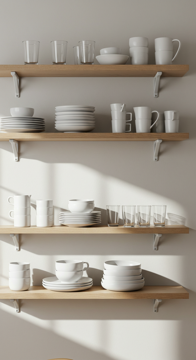 Les étagères ouvertes minimalistes transforment le rangement en élément décoratif. Choisissez des étagères flottantes en bois naturel ou en métal blanc, parfaitement alignées et espacées de manière régulière.