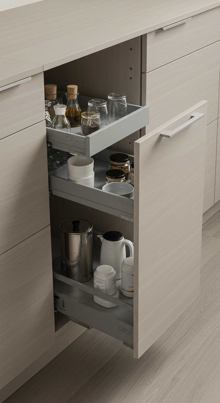 Investissez dans des systèmes de rangement modulaires : tiroirs à extraction totale, diviseurs ajustables, range-couverts sur mesure. L’objectif est de maintenir les surfaces parfaitement dégagées.