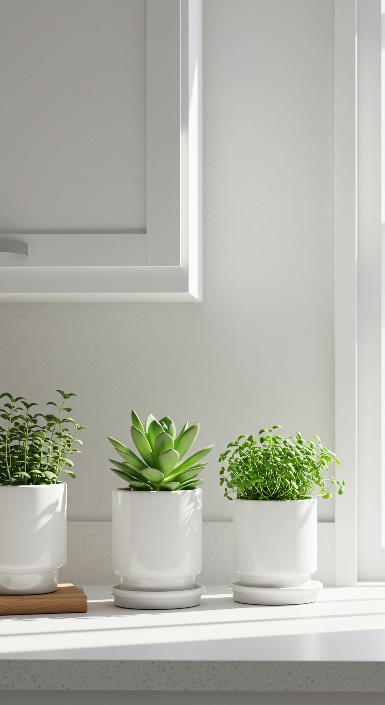 Dans une cuisine minimaliste, les plantes vertes constituent les seuls éléments décoratifs autorisés. Choisissez des espèces adaptées à l’environnement cuisine : herbes aromatiques, succulentes ou plantes dépolluantes.