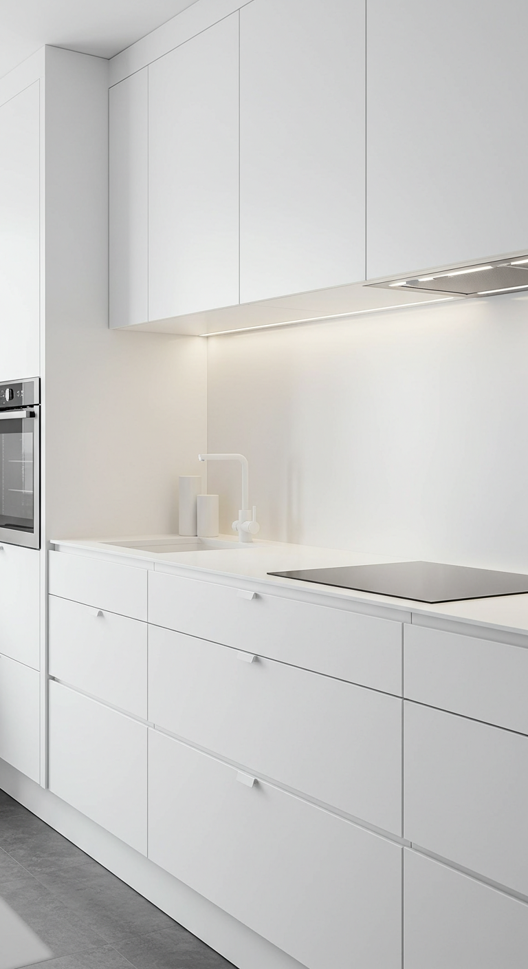 Le plan de travail en quartz blanc constitue l’élément central d’une cuisine minimaliste. Sa surface non poreuse, résistante et uniforme s’accorde parfaitement avec la philosophie du moins-c’est-mieux.