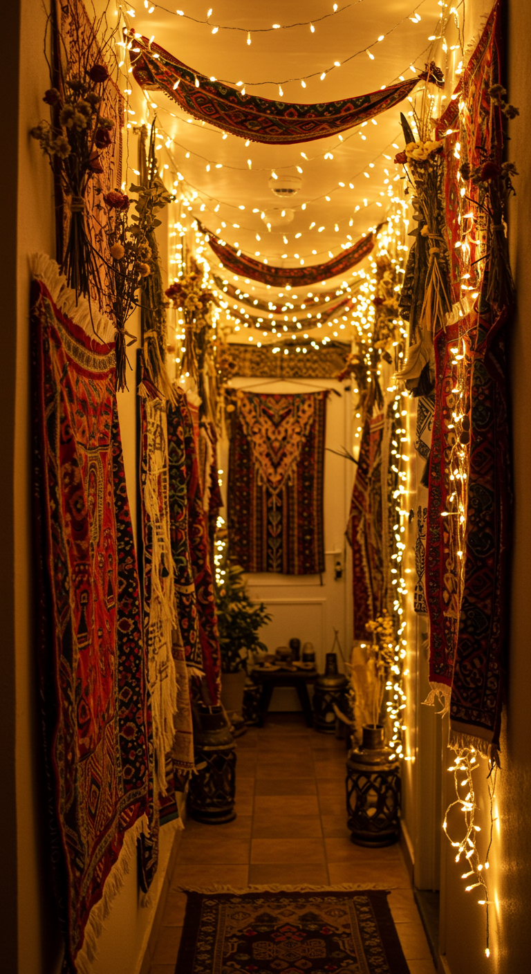 L’éclairage d’ambiance transforme instantanément l’atmosphère de votre entrée. Les guirlandes lumineuses créent une ambiance feutrée et accueillante, parfaite pour le style bohème.