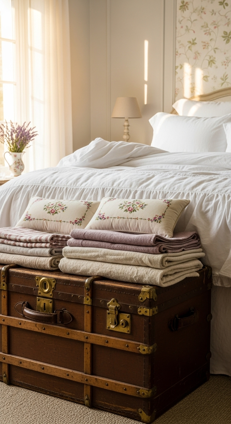 Placée au bout du lit, une malle ancienne devient un élément décoratif élégant qui ajoute une dimension pratique à votre chambre à coucher tout en renforçant l’ambiance vintage et romantique.