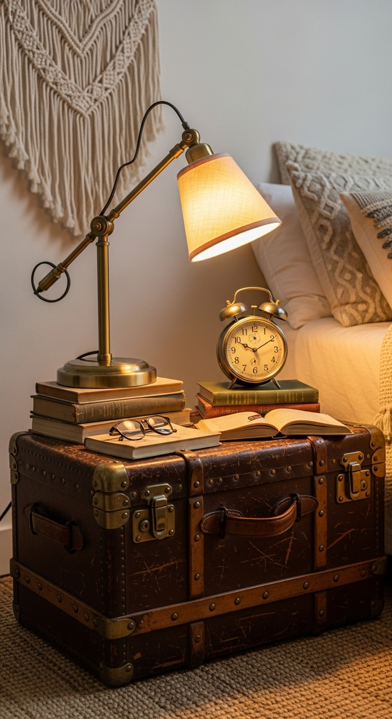 Remplacer une table de nuit traditionnelle par une petite malle ancienne apporte instantanément du caractère à votre chambre et offre une solution de rangement astucieuse pour tous ces petits objets qui s’accumulent près du lit.