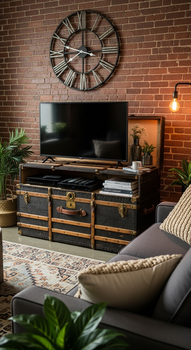 Pour un salon au style vintage affirmé, transformer une grande malle robuste en meuble TV est une solution à la fois pratique et visuellement spectaculaire qui fait de votre télévision un élément intégré au décor plutôt qu’un intrus moderne.