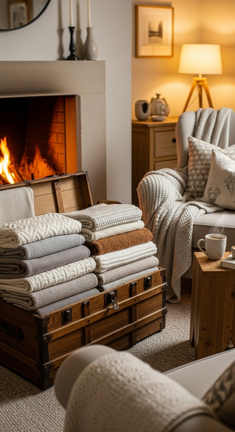 Positionnement stratégique : Placez la malle à proximité du canapé ou du fauteuil préféré, près de la cheminée, ou dans un coin lecture. Elle doit être facilement accessible pour que vous puissiez attraper une couverture lors des soirées fraîches sans effort.