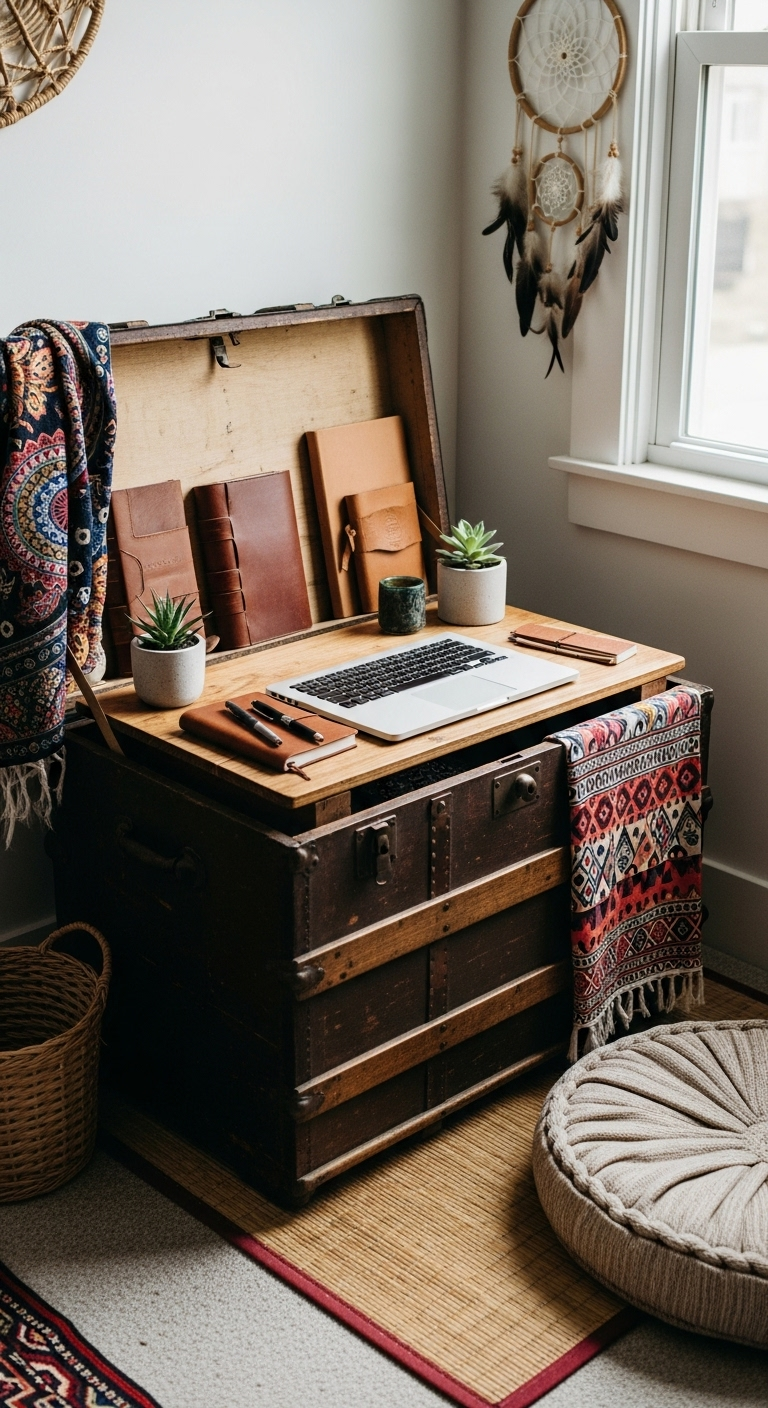 Personnalisation intérieure : Tapissez l’intérieur de la malle avec un joli papier peint vintage, du tissu, ou peignez-le dans une couleur inspirante pour créer un espace de travail qui vous motive vraiment.