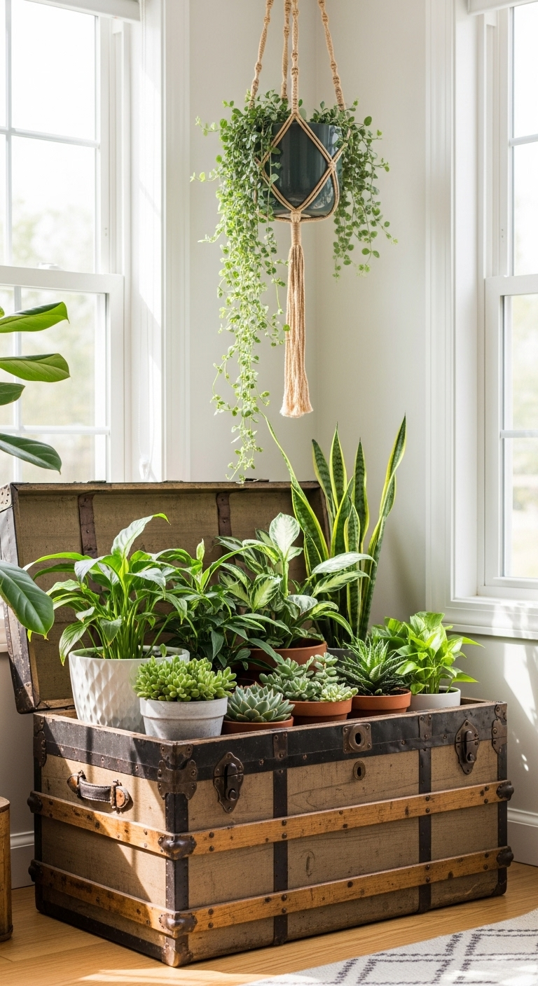 Pour les amateurs de plantes, transformer une vieille malle en jardinière est une façon originale et écologique de créer un véritable jardin d’intérieur vintage qui devient un point focal verdoyant dans votre maison.