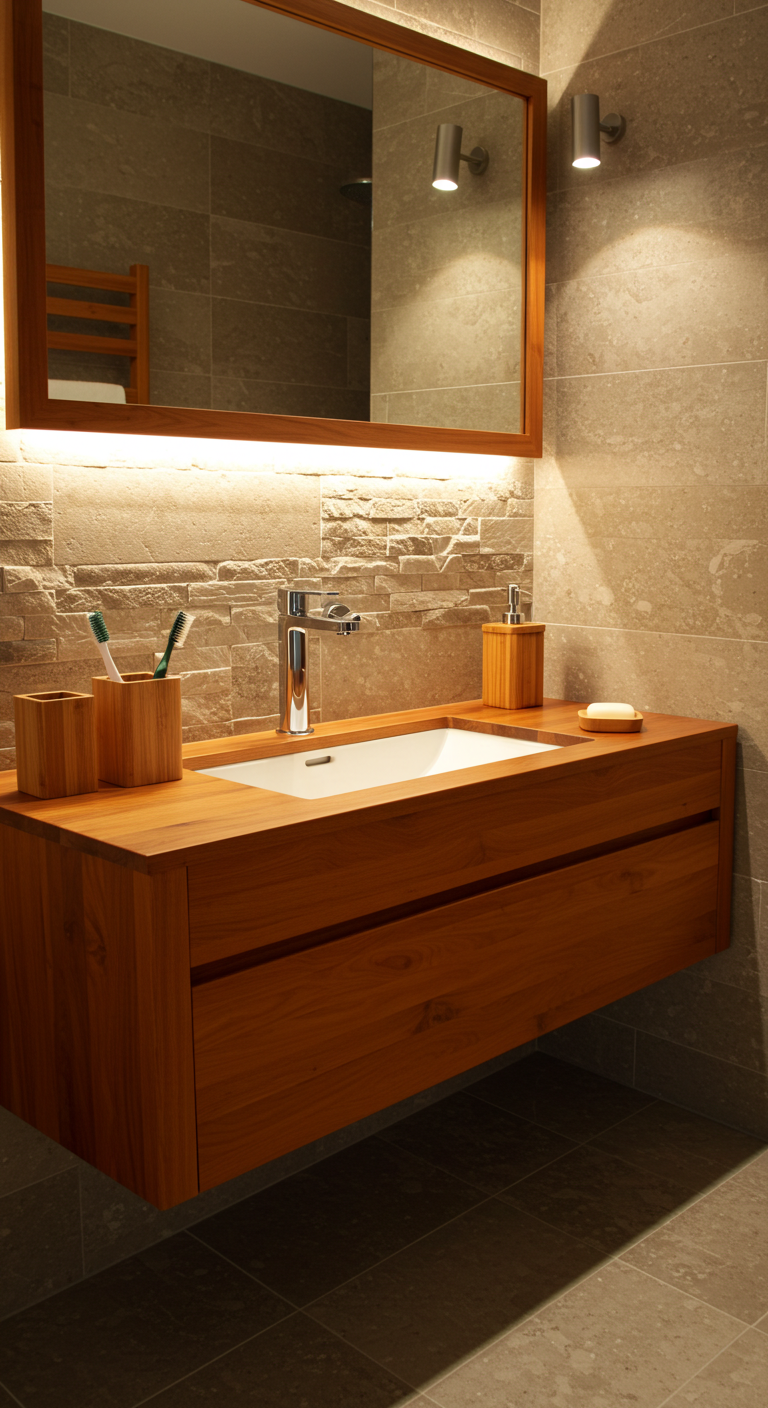 Chaque accessoire doit être fonctionnel et esthétique : distributeurs de savon en bambou, porte-brosses à dents en bois, coupelles en pierre pour les bijoux. La cohérence des matériaux renforce l’harmonie d’ensemble.