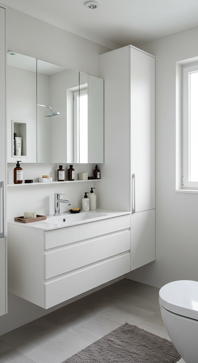 Intégrez des placards encastrés dans les murs, des tiroirs coulissants sous le plan vasque, et des niches murales pour exposer quelques éléments décoratifs choisis. L’objectif est de garder les surfaces libres et dégagées.