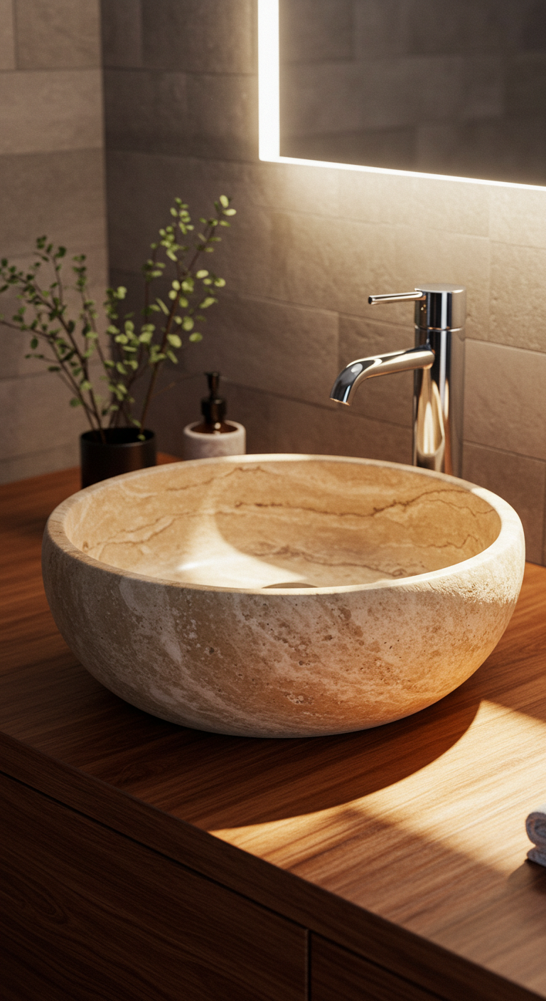 La vasque devient un élément sculptural central dans une salle de bain zen. Optez pour des matériaux naturels comme la pierre, le bois fossilisé ou la céramique aux formes organiques.