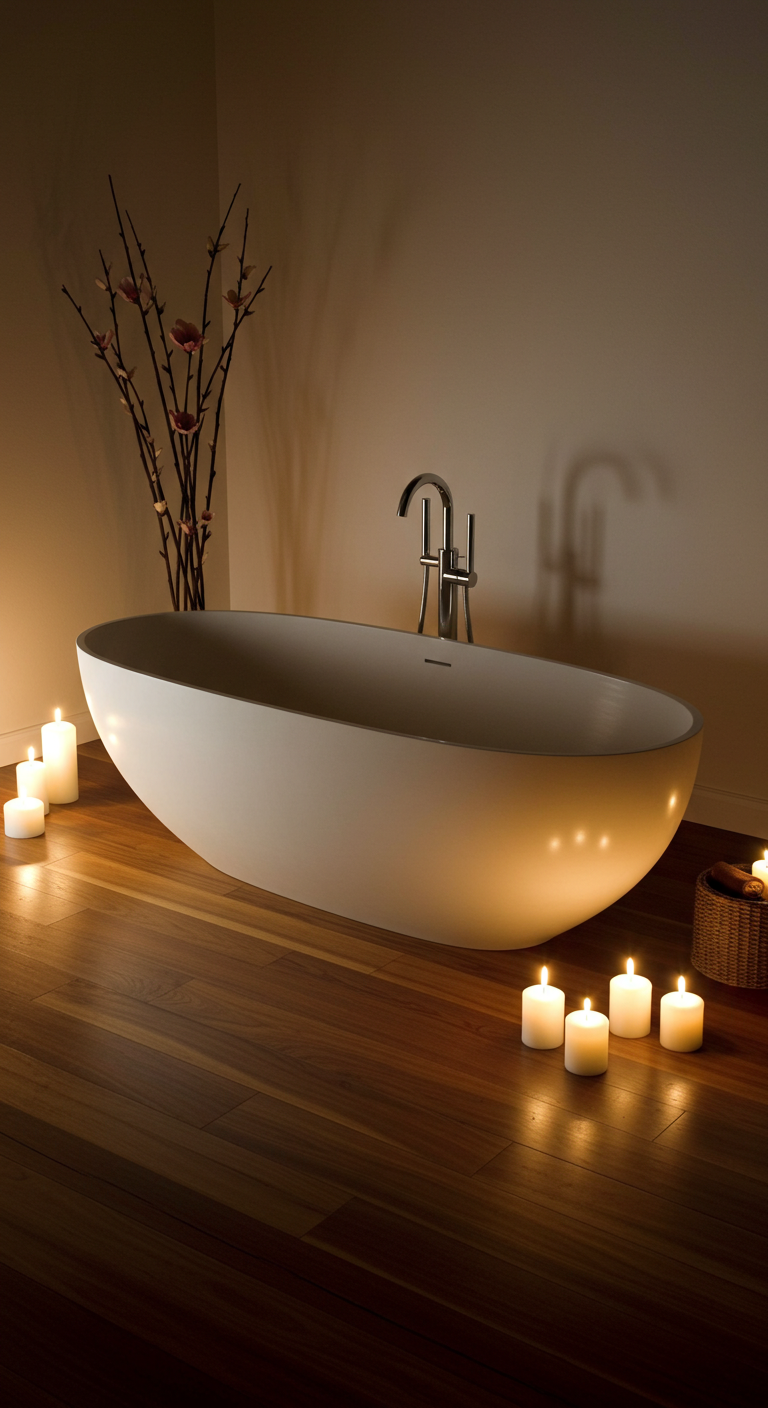 Si l’espace le permet, une baignoire îlot devient le point focal zen de votre salle de bain. Choisissez des formes organiques qui évoquent les galets polis par l’eau ou les cocons naturels.