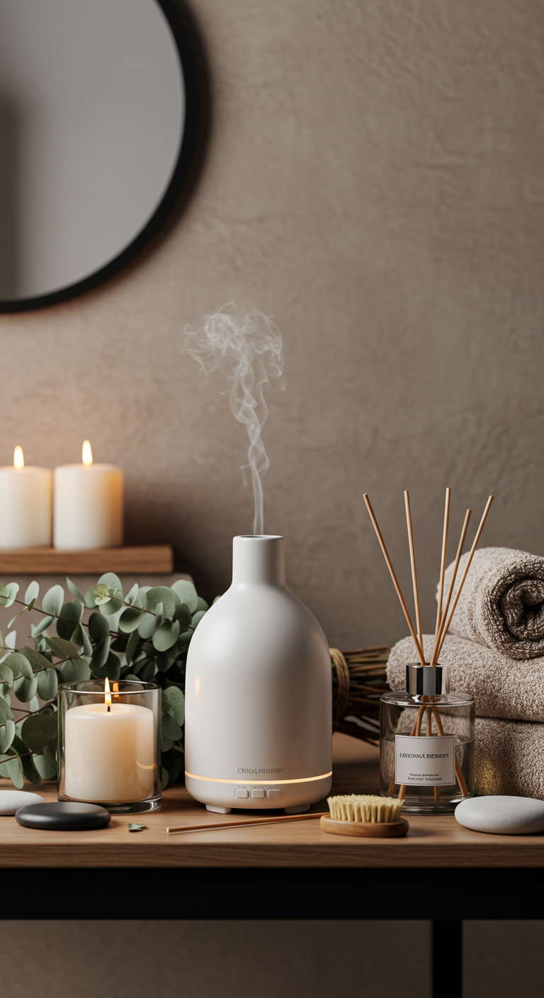 L’eucalyptus suspendu près de la douche, les bougies à la lavande pour le bain, ou un diffuseur d’huiles essentielles créent une véritable expérience spa à domicile. Choisissez des parfums apaisants qui favorisent la détente et la méditation.
