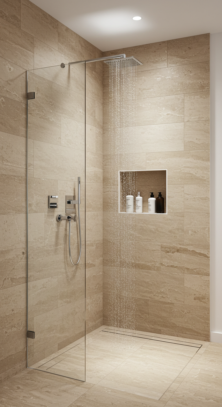 La douche à l’italienne incarne parfaitement l’esprit minimaliste zen. Sans seuil ni porte, elle fluidifie l’espace et crée une continuité visuelle apaisante.
