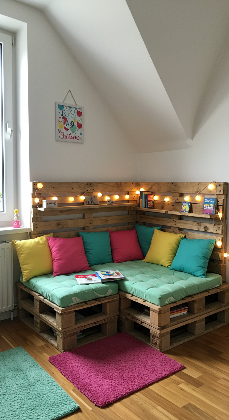 Transformez des palettes en bois récupérées en un coin lecture absolument charmant ! Cette solution ultra-économique (souvent gratuite) permet de créer un espace détente personnalisé. Poncez légèrement les palettes, ajoutez quelques coussins colorés et une guirlande lumineuse à LED pour une ambiance magique.