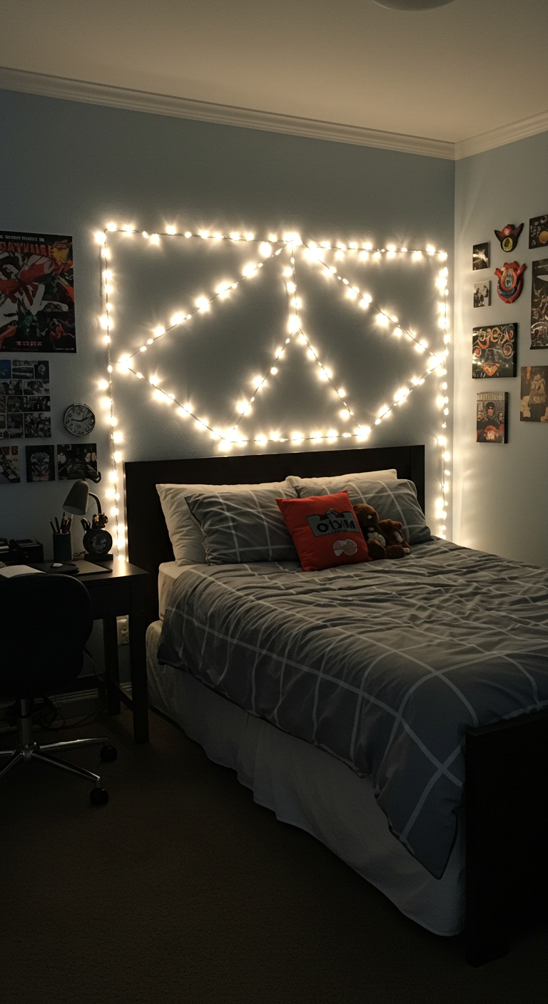 Créez une tête de lit féerique sans dépenser une fortune ! Les guirlandes LED disposées en motifs géométriques ou organiques transforment le mur au-dessus du lit en véritable œuvre d’art lumineuse.