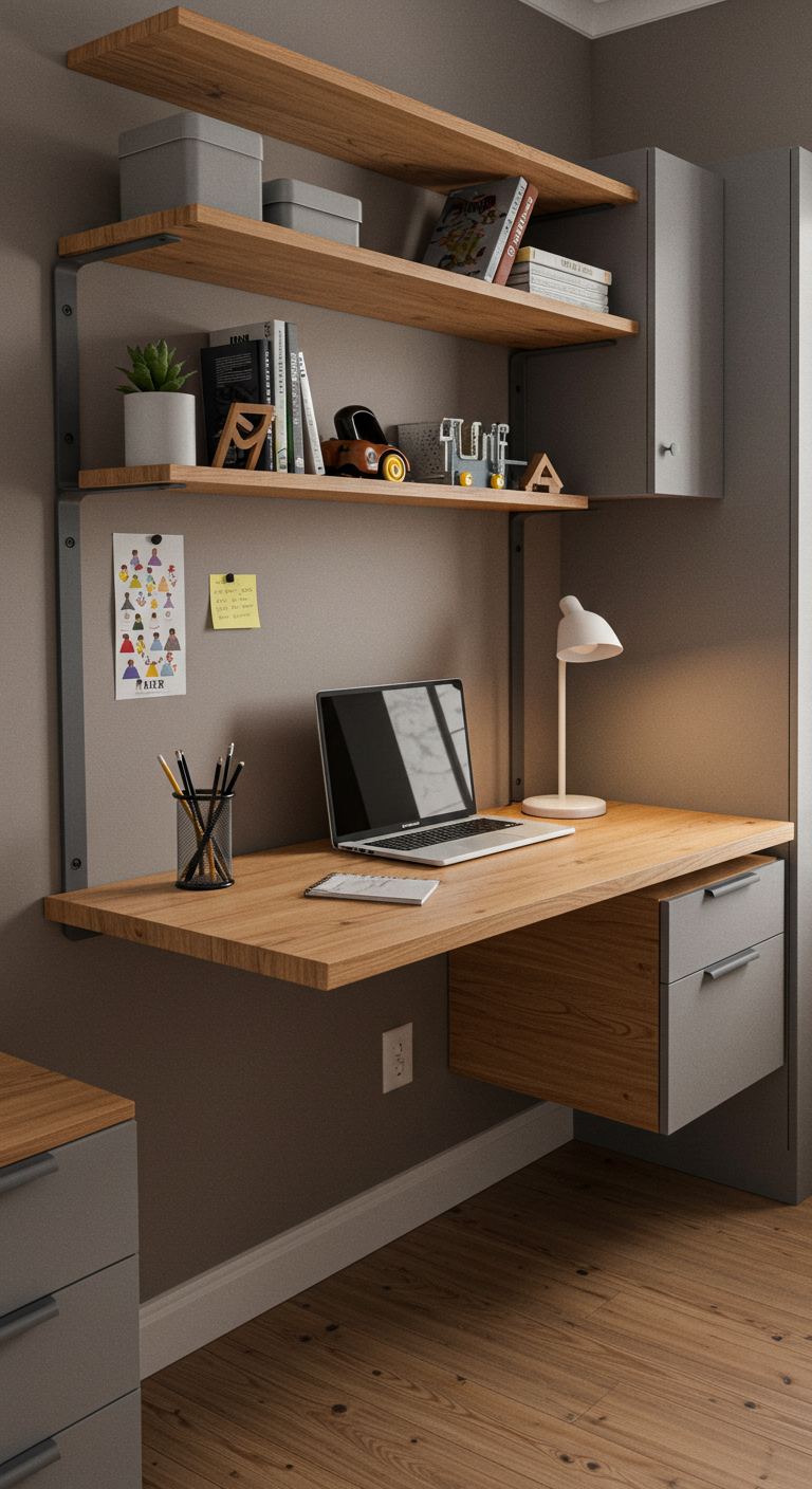 Maximisez l’espace au sol avec un bureau suspendu ! Cette solution maligne libère de la place pour d’autres activités tout en créant un coin travail efficace. Une planche de bois et des équerres solides suffisent !